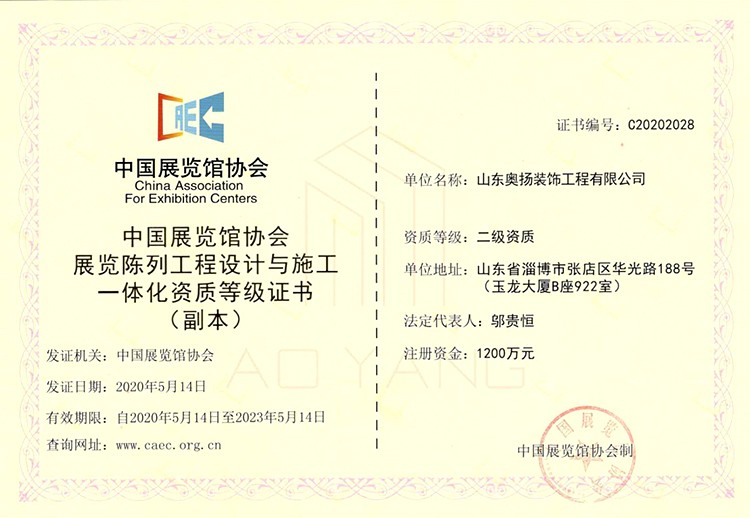 中國展覽館協會展覽陳列工程設計與施工一體化資質等級證書